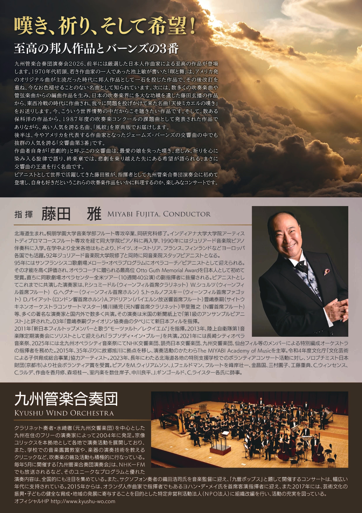 ピアニストとし世界で活躍してきた藤田雅が、指揮者として九州管楽合奏団演奏会に初めて登壇し、自身も好きだというこれらの吹奏楽作品をいかに料理するのか、楽しみなコンサートです。